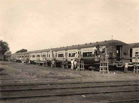 Painting the new electric coaching stock in the carriage shops at Parel during December 1927.